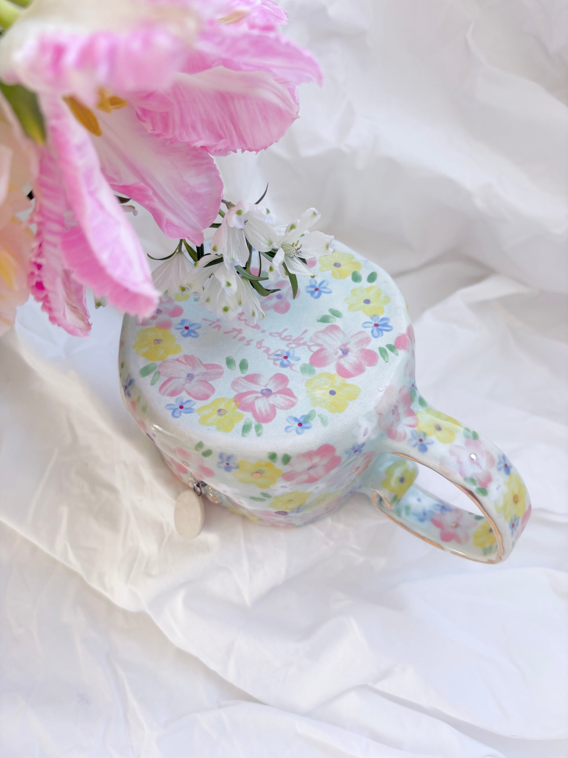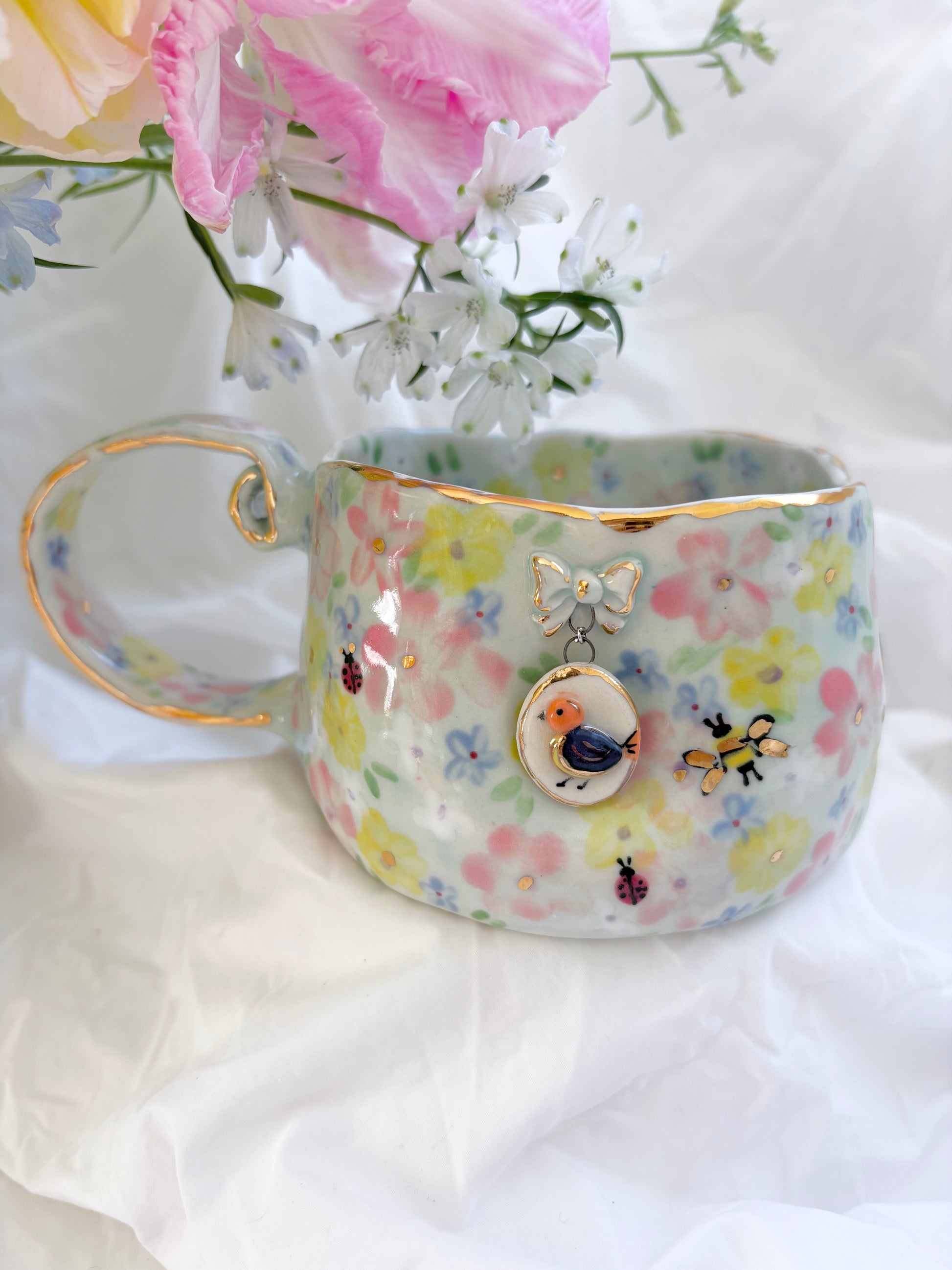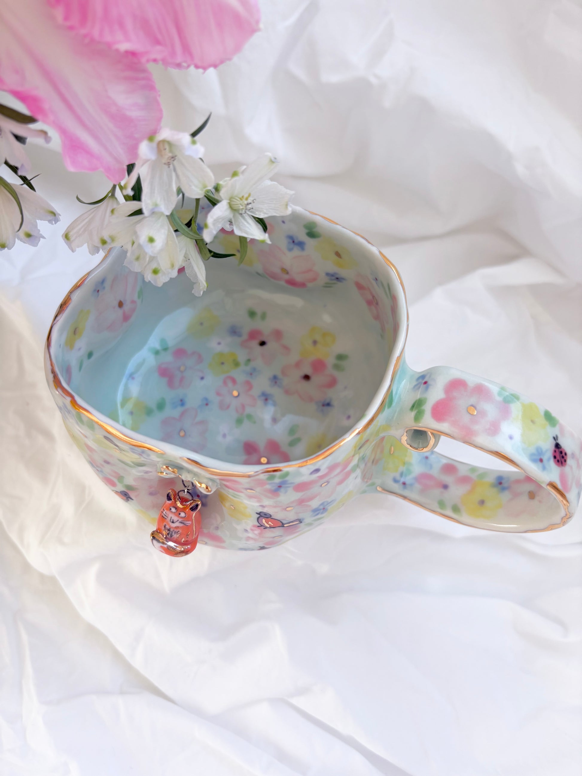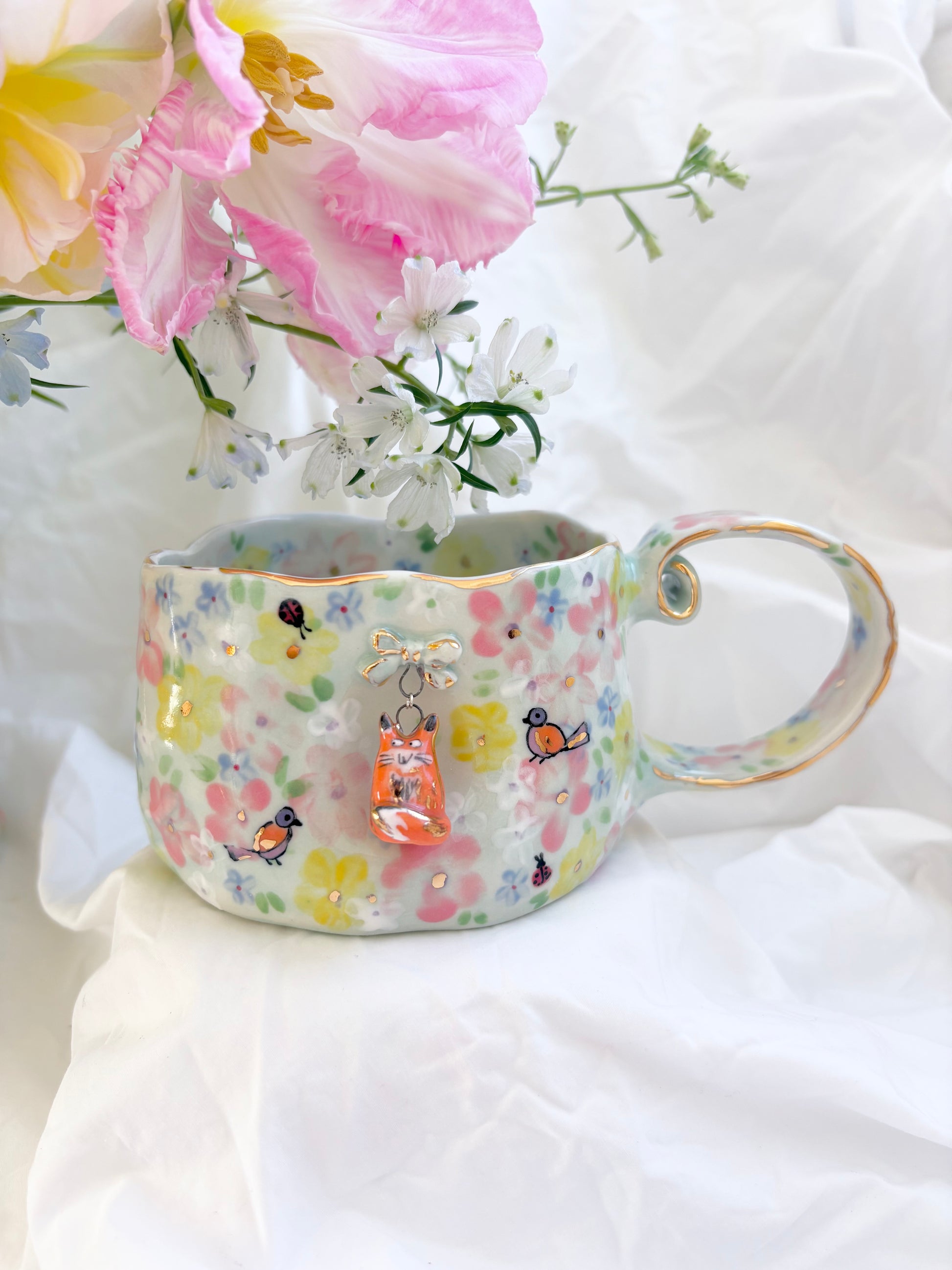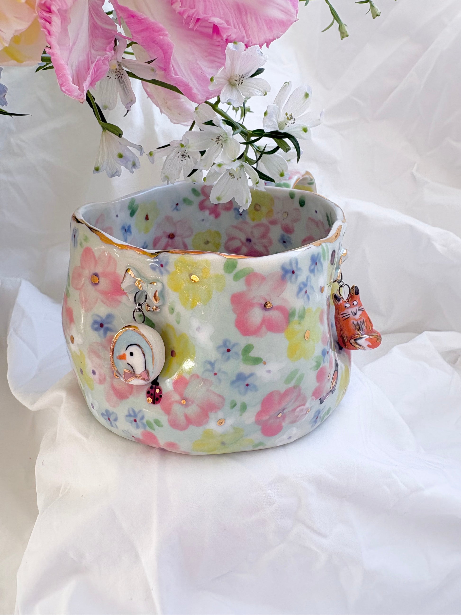 🧚made from mid fire clay, underglaze, food safe glaze and 14k gold lustre